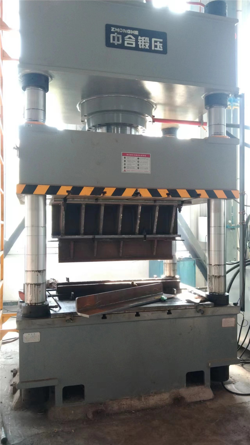 630噸金屬折彎壓型液壓機是用于金屬厚板的折彎壓型的設備,整體采用三梁四柱結構,利用金屬的延展性,通過模具將厚板壓型折彎。如下圖: